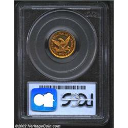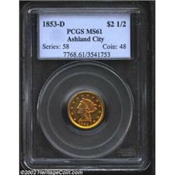 1853-D $2 1/2 MS61 PCGS. Winter 16-L. A dazzling example of this low mintage Southern gold rarity, last sold in our 2001 FUN Sale with the description that follows: "Almost fully prooflike and remarkable as such; this is one of just a small handful of Dahlonega gold coins known that has naturally reflective surfaces. Both the obverse and reverse show intense splashes of fiery orange-gold color and have excellent overall detail for this typically soft issue. There are a few light marks and scattered, raised mint-made die lines whose significance are enhanced by the depth of the reflectiveness in the fields. This coin has an appearance like no other 1853-D quarter eagle we have seen or heard of and it is regarded as the third finest known. The 1853-D is a very scarce coin in any grade with an estimated 65-75 pieces known. Most grade Very Fine to Extremely Fine and accurately graded About Uncirculated pieces are rare. There are either five or six Uncirculated 1853-D Quarter Eagles. The finest is a PCGS MS 61 in the Duke's Creek Collection that was originally lot 1275 in Mid-America's May, 1985 Jasper Robertson sale, and the second finest is the North Georgia coin (lot 7653) that we sold in January, 1999 for $36,800; it is currently in an NGC MS 62 holder. The present coin is the third finest known and is probably the most visually impressive 1853-D Quarter Eagle extant.Ex: 2001 Fun Sale (HNAI, 1/01), lot 8091, realizing $13,225. Ex: Harry Bass II (Bowers and Merena, 10/99), lot 461, where it realized $20,700; Stack's May, 1968 Sale, lot 727." From the Ashland City Collection. Important notice: We expect to be auctioning lots at the rate of 200-250 per hour. Sometimes eBay Premier live bid software cannot keep up with that pace, so we strongly recommend that you place a realistic proxy bid now as insurance to avoid disappointment. Also please note that all Heritage/CAA lots purchased through eBay Premier carry a 20% Buyer's Premium. Please make sure you read the Terms and Conditions.