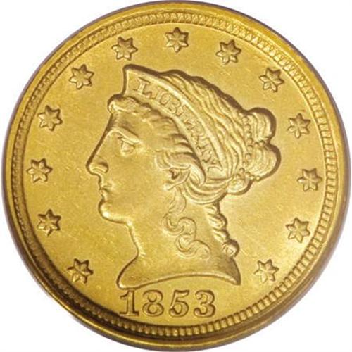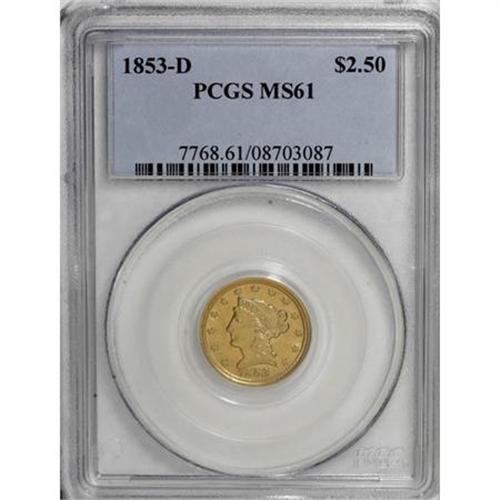 <B>1853-D $2 1/2 MS61 PCGS.</B></I> Variety 16-M. A smooth apricot-gold representative with uncommonly mark-free fields and devices. Sharply struck throughout most of the design, particularly on the stars, wings, eagle's neck, shield, and hair above the coronet. The left side dentils are soft, and the eagle's left (facing) leg is moderately weak. Glowing luster flows throughout the devices and borders, while the fields offer a hint of reflectivity. Even for the Dahlonega Mint, the 1853-D quarter eagle has a minuscule emission. Just 3,178 pieces were issued. Although rare in all grades, the majority of survivors are clustered in VF-AU grades. PCGS and NGC combined have certified only 14 pieces in Mint State, some of which may represent resubmissions. Population: 4 in 61, 2 finer (6/07).<BR><BR><B>Coin Engraver:</B> Christian Gobrecht<BR><BR><b>Shipping:</b> Coins & Currency (<a target="_blank" href="http://www.heritageauctions.com/common/shipping.php">view shipping information</a>\)