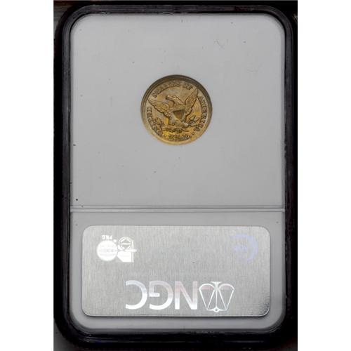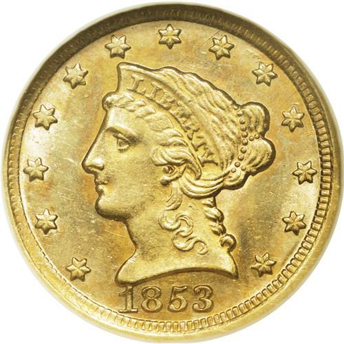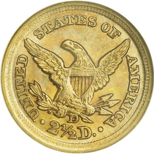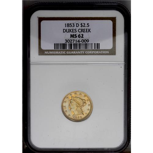 <B>1853-D<$2 1/2> MS62 NGC.</B></I> Variety 16-M. The only variety of the year. The reverse die is the same as seen on all quarter eagles struck at Dahlonega from 1847 through 1859.<BR> An average strike for the date, with some weakness on the curls around the face and on the reverse at the eagle's left leg and right claw. The surfaces are somewhat granular in texture, as commonly seen on this issue, and a good deal of mint luster clings to lightly marked fields. There is one small mark at the base of Liberty's neck, and the reverse is quite clean. Both sides show orange-gold toning, with rich blue shades on the highpoints.<BR> Despite a very low mintage figure of 3,178 pieces, the 1853-D is overshadowed by the 1854-D, 1855-D, and 1856-D quarter eagles. Fewer than 100 examples of the 1853-D are known in all grades, and the average specimen is a well-worn VF or XF with poor eye appeal. There are fewer than two dozen examples known in AU, and five or six in Uncirculated. There are a total of three graded in MS62 between the two services, and this piece is clearly the finest. This coin is listed on the latest Condition Census as the finest 1853-D quarter eagle. This is another extremely important coin from the Duke's Creek Collection. It is interesting to note that this piece sold for nearly $20,000 in 1985, at a time when one could buy several serious Dahlonega coins for this sum and have quite a bit of money left over.<BR><I>Ex: Jasper Robertson (Mid-American, 5/85), lot 1275, where it brought $18,150; Leon Farmer Collection; Hancock and Harwell. The plate coin in the first edition of Doug Winter's book</B></I> Gold Coins of the Dahlonega Mint, 1838-1861.<BR><I>From The Duke's Creek Collection of Dahlonega Gold.</B></I>