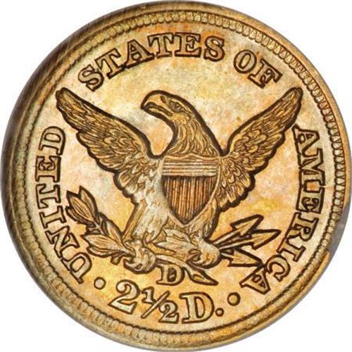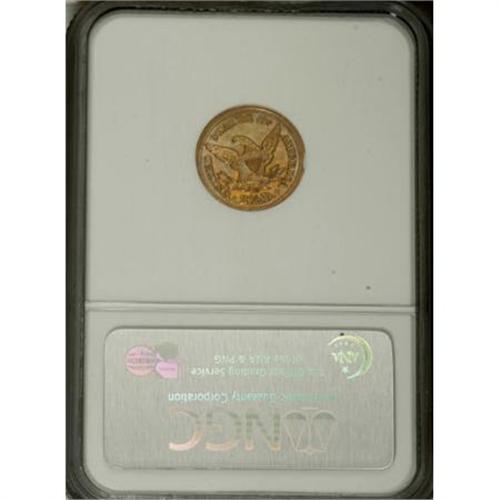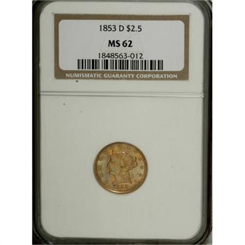 <B>1853-D $2 1/2 MS62 NGC.</B></I> Variety 16-M. Attractively toned in unusual powder-blue, olive, and orange shades. Luster dominates this unabraded Dahlonega quarter eagle. The strike is surprisingly sharp on the curls, stars, and eagle's neck, with incompleteness limited to the eagle's left (facing) leg and right claw. The 1853-D has a tiny production of 3,178 pieces, since half eagles were the favored denomination of gold depositors. Most certified 1853-D examples are in XF or AU grades, and Uncirculated survivors are very rare. At the MS62 level, the present piece qualifies for high placement within the condition census, since none have been certified finer at either major service. Census: 3 in 62, 0 finer (1/08).<BR><BR><B>Coin Engraver:</B> Christian Gobrecht<BR><BR><b>Shipping:</b> Coins & Currency (<a target="_blank" href="http://www.heritageauctions.com/common/shipping.php">view shipping information</a>)