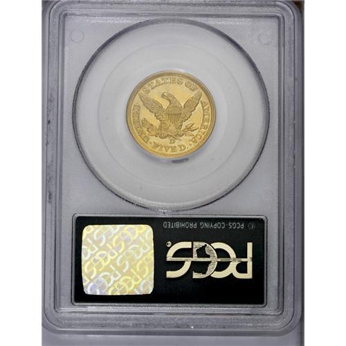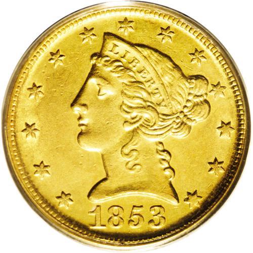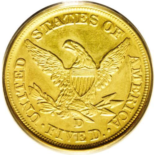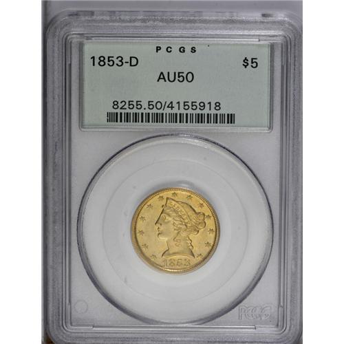 <B>1853-D<$5> AU50 PCGS.</B></I> Variety 29-V. The most common (if such a term can be used in connection with half eagle issues from the Georgia branch mint) D-mint half eagle, the 1853-D is always in demand among collectors for advanced type purposes. This is an above average representative of the issue in terms of eye appeal and the denticles are nearly fully defined. Although lightly abraded, the surfaces are quite attractive and show original green-gold color with some reflectivity in the protected areas.<BR><I>From The Derrick Snider Collection.</B></I>