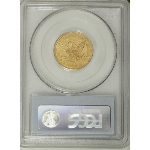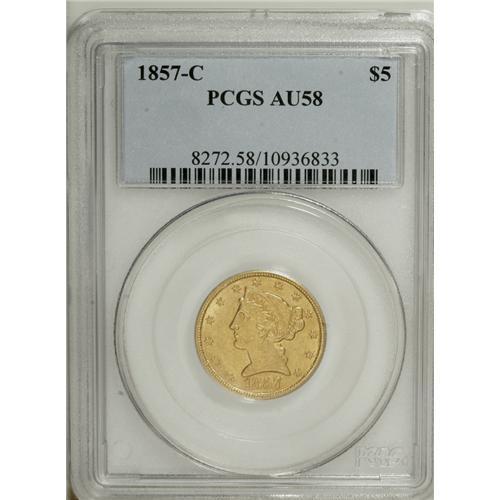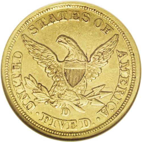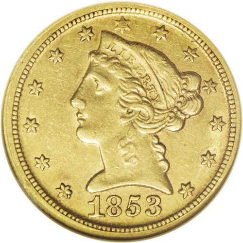 <B>1853-D $5 Large D AU55 NGC.</B></I> Variety 29-T. One of four reverses found for the 1853-D, all paired with a single obverse die. On this reverse, the D is high and left, with the upright over the center of V in FIVE. This appealing D-mint half eagle is notable for total originality and near-absence of surface marks. As such, all prospective buyers of a picture-perfect Dahlonega type coin should really take a look.<BR><BR><b>Shipping:</b> Coin/Currency (<a target="_blank" href="http://www.heritageauctions.com/common/shipping.php">view shipping information</a>)
