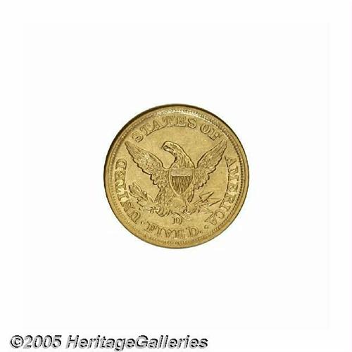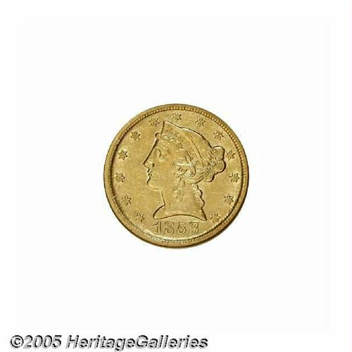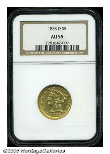 <B>1853-D<$5> Large D AU55 NGC.</B></I> Variety 29-V. Although popular as the most available D-mint Half Eagle, the 1853-D presents a challenge to collectors in grades above the lower reaches of AU. Offered here is a light green-gold example with wispy hairlines in the fields, and a few tiny, scattered contact marks. The strike is typically soft on the lower left obverse denticles, a few of the obverse stars, the arrow feathers, and the eagle's right (facing) talons. Overall a rather pleasing example of this Dahlonega issue.