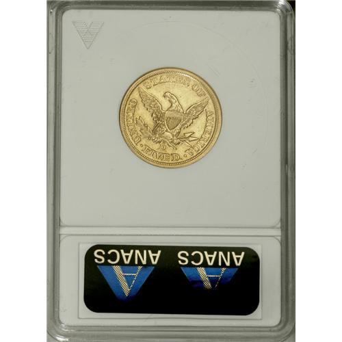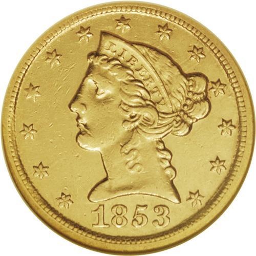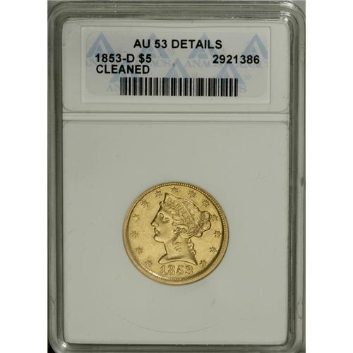 <B>1853-D $5 Large D--Cleaned--ANACS. AU53 Details.</B></I> Variety 29-T. Bright and hairlined from a moderate cleaning, but substantial luster bathes the devices and borders, and the only noticeable mark is located beneath Liberty's chin. Although the surfaces are a bit bright, many would be pleased to have this coin as a Dahlonega type piece.<BR><BR><b>Shipping:</b> Coin/Currency (<a target="_blank" href="http://www.heritageauctions.com/common/shipping.php">view shipping information</a>)