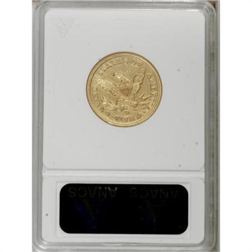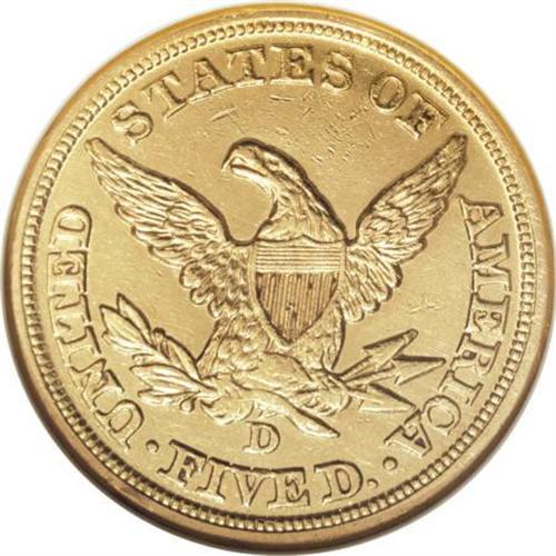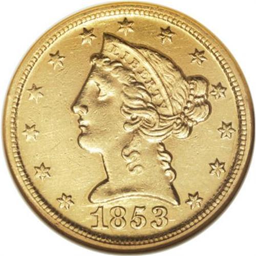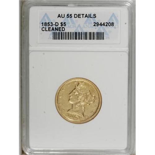 <B>1853-D $5 Large D--Cleaned--ANACS. AU55 Details.</B></I> Variety 29-T. This mildly bright Dahlonega representative is well struck save for star 4 and the fletchings. Close scrutiny with the aid of a loupe locates a faint pinscratch along the profile and faint marks near the date. The reverse has a minor rim bruise at 7 o'clock.<BR><BR><b>Shipping:</b> Coins & Currency (<a target="_blank" href="http://www.heritageauctions.com/common/shipping.php">view shipping information</a>)