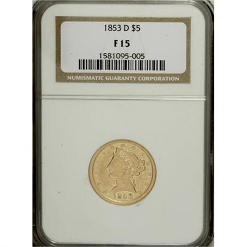 <B>1853-D $5 Large D Fine 15 NGC.</B></I> Variety 29-U. This Dahlonega Mint collector coin has substantial plumage detail on the eagle's left (facing) wing, and LIBERTY is bold aside from the upper left corner of the L. A bit bright, but free from remotely relevant marks.<BR><BR><B>Coin Engraver:</B> Christian Gobrecht<BR><BR><b>Shipping:</b> Coins & Currency (<a target="_blank" href="http://www.heritageauctions.com/common/shipping.php">view shipping information</a>)