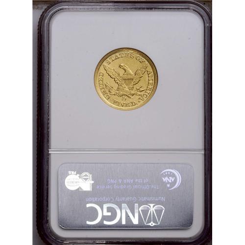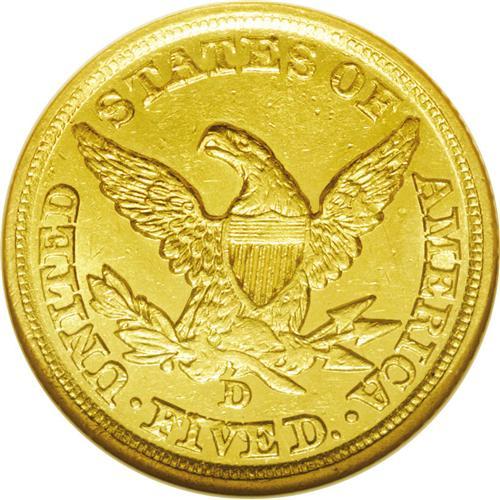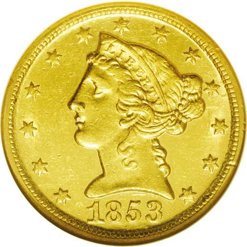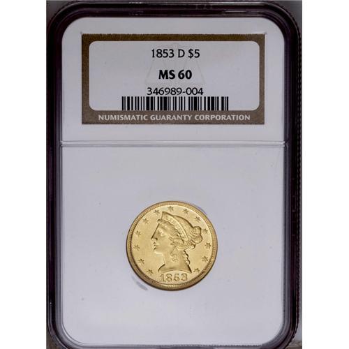 <B>1853-D<$5> Large D MS60 NGC.</B></I> Variety 29-T. This lightly abraded example has noticeable luster and generally unblemished surfaces. Minor striking weakness is noted on Liberty's forehead curls and eyebrow, and on the eagle's claws and fletchings. The left side stars also show some softness. However, the eagle's shield and the hair near the eye have pleasing sharpness. Census: 7 in 60, 25 finer (4/06).