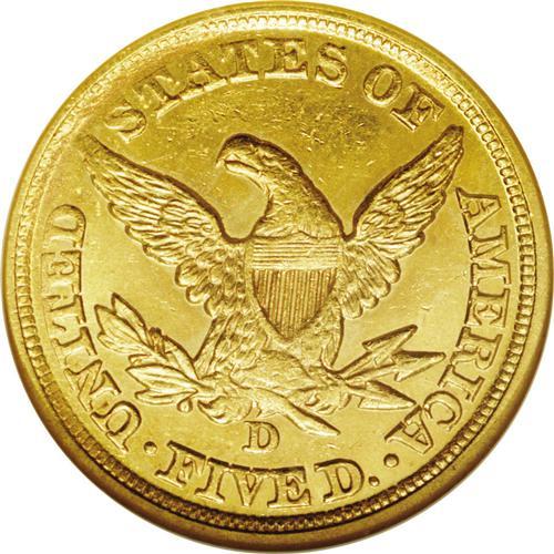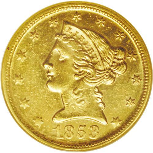 <B>1853-D<$5> Large D MS61 NGC.</B></I> Variety 29-T. One of four die pairings for the 1853-D, all from a single obverse die and each having a large D mintmark. On this reverse, the D is high and left, with the upright over the center of V in FIVE. The left top nearly touches a talon to the left, and the tip of the arrow feather is very close over the center of the upright of D. Although considered the most obtainable of the Dahlonega half eagles, precious few 1853-D fives survive in Mint State grades. This lustrous example displays intermittent softness along the lower and left obverse periphery while striking deficiency is also noted on the eagle's neck. Two different textures are noted, mildly prooflike on the obverse and more satiny on the reverse. Census: 13 in 61, 12 finer (4/06).