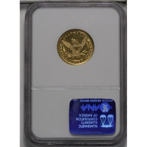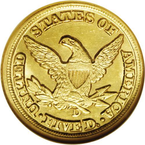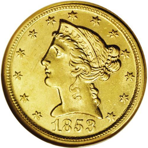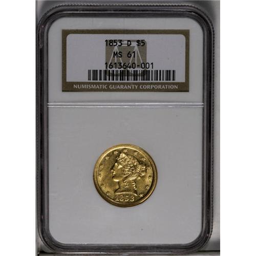 <B>1853-D<$5> Large D MS61 NGC.</B></I> Variety 29-U. At least four different reverse dies are known for this Dahlonega issue, although the same hardy obverse die is paired with each. The U reverse is noteworthy for light repunching on the base of the mintmark, and bold die lines through UNITED. This smooth representative has noticeable bright luster, and the strike is reasonable despite the expected slight softness on the eagle's neck and on Liberty's curls near the ear.