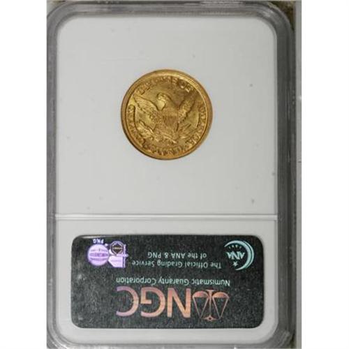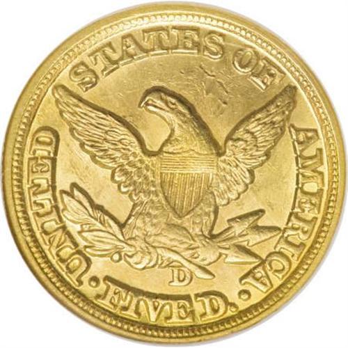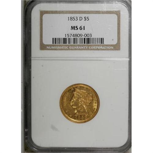 <B>1853-D $5 Large D MS61 NGC.</B></I> Variety 29-U. The mintmark is centered over the E in FIVE and solidly attached to the feather tip and branch stem. A frosty Mint State piece with yellow mint brilliance on both sides. Minor central weakness is a characteristic of most Southern mint gold coins, including this issue. Census: 17 in 61, 13 finer (10/07).<BR><BR><B>Coin Engraver:</B> Christian Gobrecht<BR><BR><b>Shipping:</b> Coins & Currency (<a target="_blank" href="http://www.heritageauctions.com/common/shipping.php">view shipping information</a>)