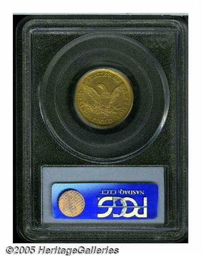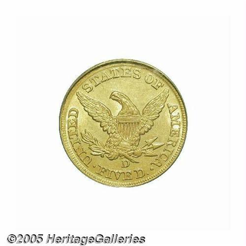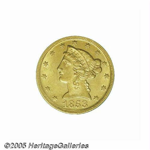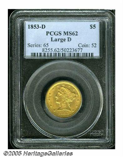 <B>1853-D<$5> Large D MS62 PCGS.</B></I> Variety 29-V. Satiny and highly appealing for the moderate grade. Note the well struck central devices of Liberty and the eagle, quite an event for the Dahlonega Mint coin. The dentils on the obverse show typical softness below and up to the left from the date and in the corresponding area on the reverse. Examination of the surfaces will find few faults, with Liberty's face and neck particularly pleasing. Even the surrounding fields show minimal signs of handling, and this is a coin which any advanced collector will be quite proud to own. In terms of rarity, this date is scarce in all Uncirculated grades, and even select circulated pieces generate significant attention. Population: 5 in 62, 6 finer (6/05).