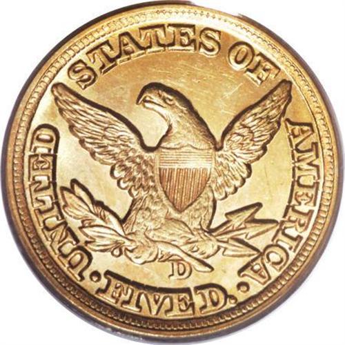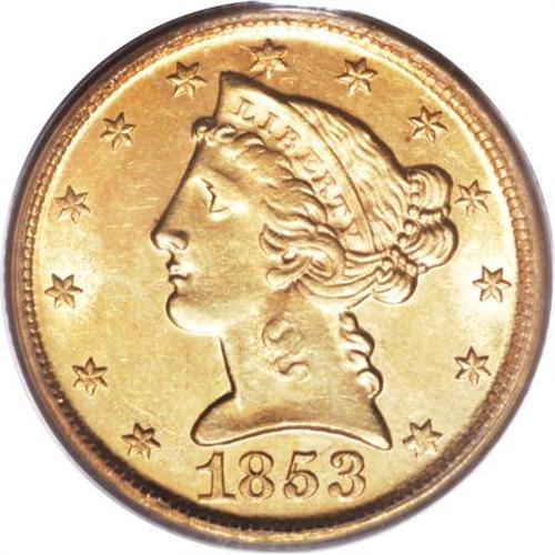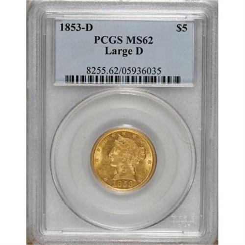 <B>1853-D $5 Large D MS62 PCGS.</B></I> Variety 29-U. The satiny and softly shimmering surfaces of this marvelous Mint State representative exhibit warm yellow-orange color with a handful of delicate, deeper overtones. While the stars and other peripheral elements on the obverse are slightly weak, the centers are strong, and the overall eye appeal is noteworthy. The obverse has few marks for the grade, though the upper and right reverse fields show wispy abrasions.<BR> This is an important example that would make an excellent addition to a date set or stand out as a marquee coin in a broader collection. Though the 1853-D half eagle is widely known as one of the most easily obtainable pieces of early branch mint gold, even this "available" issue becomes elusive in Mint State grades, and the population figures are doubtless influenced by resubmissions. Population: 9 in 62, 6 finer (5/07).<BR><BR><b>Shipping:</b> Coins & Currency (<a target="_blank" href="http://www.heritageauctions.com/common/shipping.php">view shipping information</a>)
