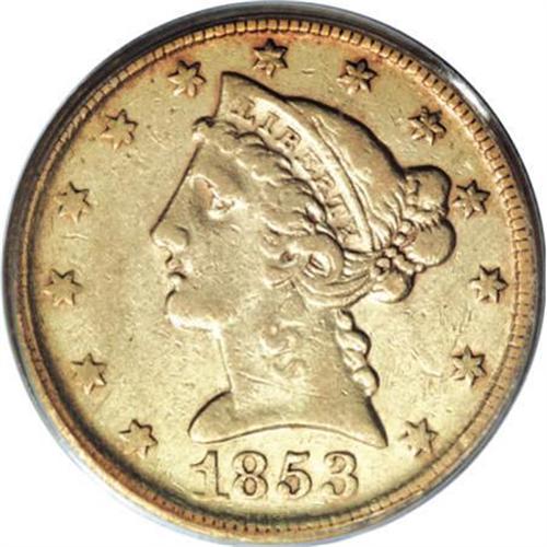 <B>1853-D $5 Large D VF30 PCGS.</B></I> Variety 29-V. The 1853-D is the most frequently encountered D-mint five, and as such is the logical choice for a type coin. Even after 30 points of wear the fields still retain much brightness, indicating this must have been a fully prooflike coin when new. The obverse shows a bit more wear over the highpoints than does the reverse, and the highpoints also show reddish patina which creates a sharp, two-toned contrast.<BR><BR><B>Coin Engraver:</B> Christian Gobrecht<BR><BR><b>Shipping:</b> Coins & Currency (<a target="_blank" href="http://www.heritageauctions.com/common/shipping.php">view shipping information</a>)