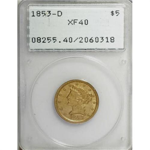 <B>1853-D $5 Large D XF40 PCGS.</B></I> Variety 29-T. One of four die marriages known for the date, all of which share the same obverse die. This richly detailed XF Dahlonega half eagle has original green-gold surfaces, and is void of detrimental marks. A good strike with only minor merging on the eagle's neck and fletchings and on the lower obverse denticles. Certified in a first generation holder.<BR><I>From The John Stimson, Sr. Collection, Part One.</B></I><BR><BR><B>Coin Engraver:</B> Christian Gobrecht<BR><BR><b>Shipping:</b> Coins & Currency (<a target="_blank" href="http://www.heritageauctions.com/common/shipping.php">view shipping information</a>)