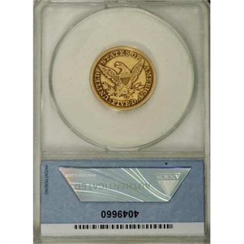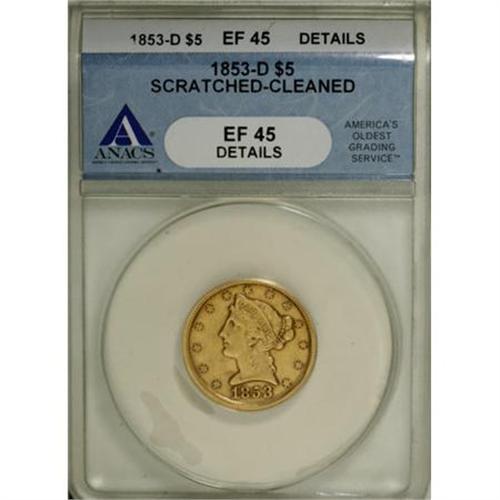 <B>1853-D $5 Large D--Scratched, Cleaned--ANACS. XF45 Details.</B></I> Variety 29-U. The mintmark touches both the branch and feather, and its base is lightly repunched. A green-gold example that has russet toning within reverse design crevices. Moderately hairlined, and Liberty's cheek has a subdued, curved scratch.<BR><BR><B>Coin Engraver:</B> Christian Gobrecht<BR><BR><b>Shipping:</b> Coins & Currency (<a target="_blank" href="http://www.heritageauctions.com/common/shipping.php">view shipping information</a>)