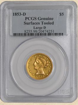 1853-D $5 Liberty Genuine PCGS Large D