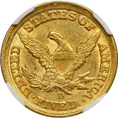 1853-D $5 Liberty. NGC graded MS-61. An untoned example exhibiting a nice bold even strike at centers with a minor scuff in the luster before the face. Intense but still abundant frost, the coin brilliant with a soft golden color through which brighter gold radiance persists around the devices. Nicely struck for the date, perhaps not entirely so at the rims which tend to lack detail on the dentils, but certainly a coin that gets proper mention where completeness of design in a Dahlonega Mint half eagle of this decade is almost impossible to obtain. In a new NGC 4 pronged holder.Pop 19; 13 finer, 6 in 62, 4 in 63, 3 in 64.
