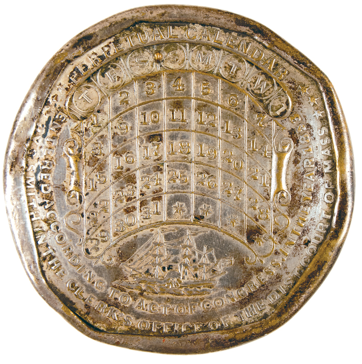This extremely rare George B. McClellan Perpetual Calendar measures 1.5" in diameter and retains almost all of its original Silvering. Obverse: central Photographic Portrait of McClellan, surrounded by 34 Stars and with an outer ring legend that reads, “The Constitution and Union Forever - Ellis & Read, Springfield, Mass.” Reverse: Calendar numbered 1 thru 31, with a Paddlewheel Sailing Ship with surrounding legend that reads, “Perpetual Calendar - Entered According to Act of Congress in the Year 1853 - by S. Smith in the Clerk’s Office of the District Court of Mass”. The circular frame has been somewhat flattened primarily on its reverse side, thus the moveable panel is stationary. The obverse portrait has a small blister to the right of McClellan's mustache which is hardly noticeable viewed straight on. This extremely rare 1853 George B. McClellan Portrait Perpetual Calendar is an exciting item, needed by virtually every collector.