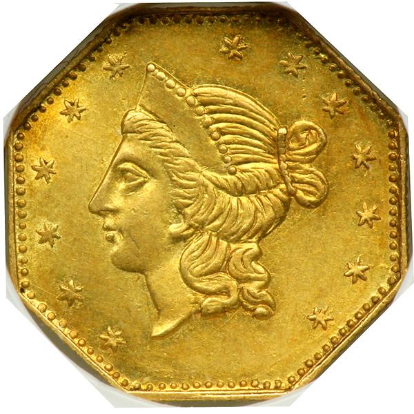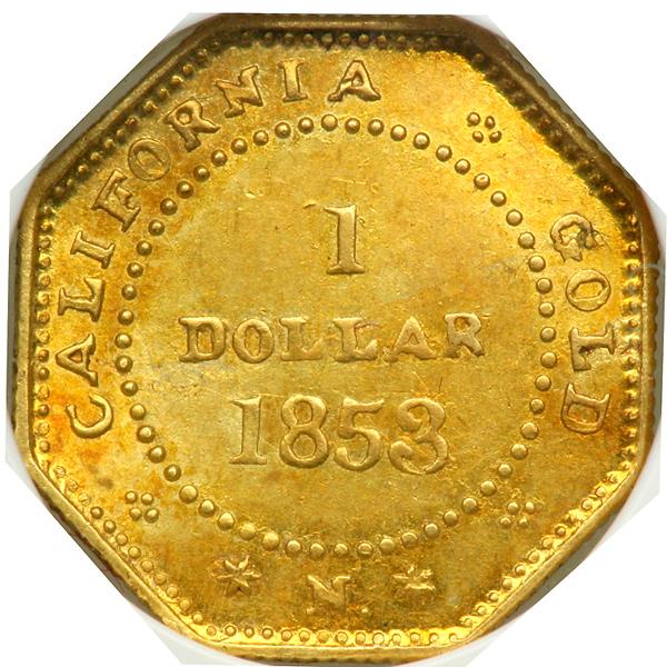 1853 Dollar Octagonal Liberty. BG-530 Rarity 2. NGC graded MS-61. Nice golden toning with soft, smooth luster throughout. The Liberty head is finely detailed -- and even shows the pearls or beads lining the upper edge of the coronet (rarely seen). As handsome as any found in this modest Uncirculated grade. Desirable 1 DOLLAR denomination. Pop 11; 29 finer at NGC.