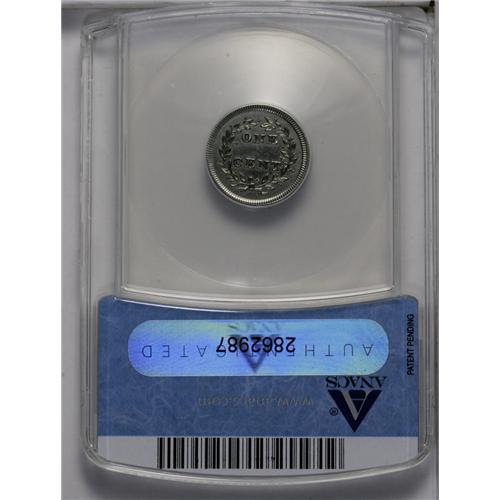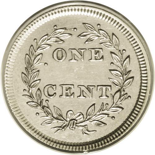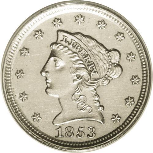 <B>1853<E1C> One Cent, Judd-149, Pollock-178, High R.6, PR61 ANACS.</B></I> The obverse die is the regular issue 1853 Liberty quarter eagle. The reverse die, however, displays the widely spaced denomination ONE CENT within a laurel wreath. Struck in German silver alloy with a reeded edge. This precisely struck slate-gray specimen is lightly hairlined, and can be identified by a short vertical lintmark above the center of the bust truncation.<BR><I>Ex: John L. Harris Collection (Stack's, 11/50), lot 65.</B></I><BR><I>From The Redfjord Collection.</B></I>