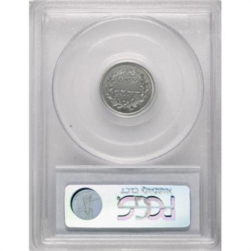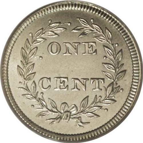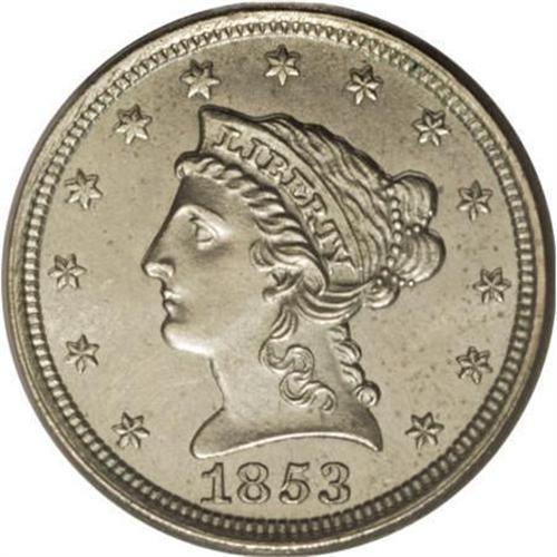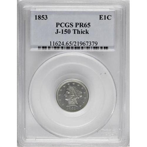 <B>1853 E1C One Cent, Judd-150 Thick, Pollock-178, Low R.7, PR65 PCGS.</B></I> The obverse is the same as the regular issue 1853 quarter eagle. The pattern reverse die bears the denomination ONE CENT within a wreath. The E in CENT is widely but lightly repunched north. Struck with a reeded edge in an alloy of 30% nickel, 60% copper, and 10% tin. A nicely mirrored cream-gray Gem with traces of pale gold toning. Well struck and unabraded with minor obverse strike doubling.<BR><BR><b>Shipping:</b> Coins & Currency (<a target="_blank" href="http://www.heritageauctions.com/common/shipping.php">view shipping information</a>)