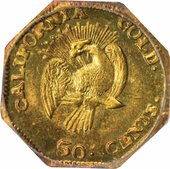 Known to have been issued in the year dated: three were recovered from the wreck of the S.S. Winfield Scott, which sailed December 1, 1853. Same head, 13 stars around, F.D. behind, but Frontier & Deviercy replaced the Humbert style eagle with one adapted from the new 1853 Arrows and Rays half dollars (perhaps thinking that this design change was permanent), 50.CENTS below. Very popular type; nicknamed “peacock” by Kagin’s founder A.M. Kagin many years ago because of the resemblance of the rays to tail feathers. A gem; pale reddish toning with specks of blue on obverse, reverse brilliant.