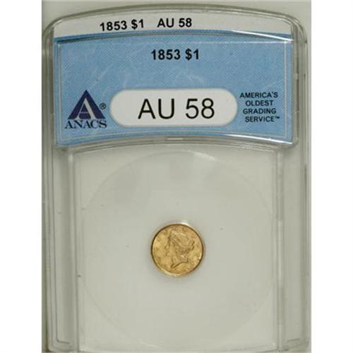 <B>1853 G$1 AU58 ANACS.</B></I> NGC Census: (825/6251). PCGS Population (967/2975). Mintage: 4,076,051. Numismedia Wsl. Price for NGC/PCGS coin in AU58: $198. (#7521)<BR><BR><b>Shipping:</b> Coins & Currency (<a target="_blank" href="http://www.heritageauctions.com/common/shipping.php">view shipping information</a>)