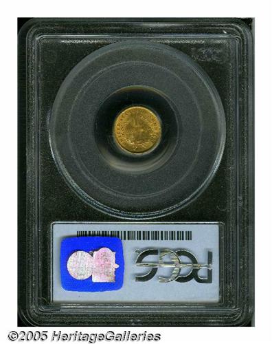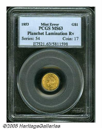 <B>1853<G$1> Gold Dollar--Planchet Lamination Reverse--MS63 PCGS.</B></I> About 20% of the reverse is occupied by a prominent strike-thru, perhaps more likely than a lamination to be the cause of this dramatic mint error. A lustrous canary-gold example, sharply struck on the obverse, which has a normal appearance. A few faint luster grazes on the obverse field determine the grade.