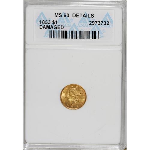 <B>1853 G$1 --Damaged--ANACS. MS60 Details.</B></I> NGC Census: (434/12020). PCGS Population (159/2816). Mintage: 4,076,051. Numismedia Wsl. Price for NGC/PCGS coin in MS60: $204. (#7521)<BR><BR><b>Shipping:</b> Coins & Currency (<a target="_blank" href="http://www.heritageauctions.com/common/shipping.php">view shipping information</a>)