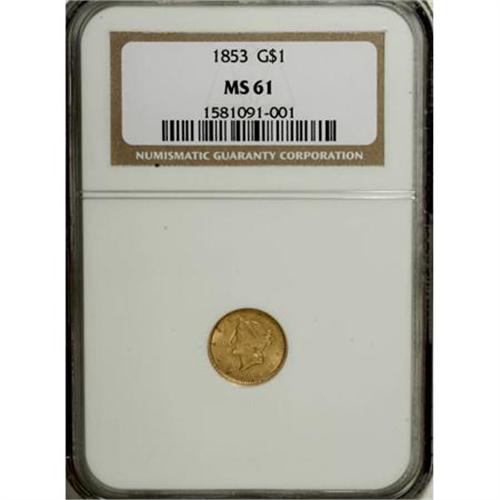 <B>1853 G$1 MS61 NGC.</B></I> NGC Census: (1651/4474). PCGS Population (431/2409). Mintage: 4,076,051. Numismedia Wsl. Price for NGC/PCGS coin in MS61: $310. (#7521)<BR><BR><B>Coin Engraver:</B> James B. Longacre<BR><BR><b>Shipping:</b> Coins & Currency (<a target="_blank" href="http://www.heritageauctions.com/common/shipping.php">view shipping information</a>)
