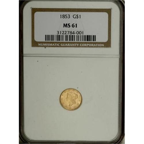 <B>1853 G$1 MS61 NGC.</B></I> NGC Census: (1755/4616). PCGS Population (435/2528). Mintage: 4,076,051. Numismedia Wsl. Price for NGC/PCGS coin in MS61: $290. (#7521)<BR><BR><B>Coin Engraver:</B> James B. Longacre<BR><BR><b>Shipping:</b> Coins & Currency (<a target="_blank" href="http://www.heritageauctions.com/common/shipping.php">view shipping information</a>)