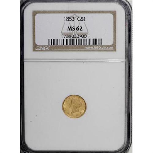 <B>1853 G$1 MS62 NGC.</B></I> NGC Census: (2425/2012). PCGS Population (1013/1380). Mintage: 4,076,051. Numismedia Wsl. Price for NGC/PCGS coin in MS62: $300. (#7521)<BR><BR><B>Coin Engraver:</B> James B. Longacre<BR><BR><b>Shipping:</b> Coins & Currency (<a target="_blank" href="http://www.heritageauctions.com/common/shipping.php">view shipping information</a>\)
