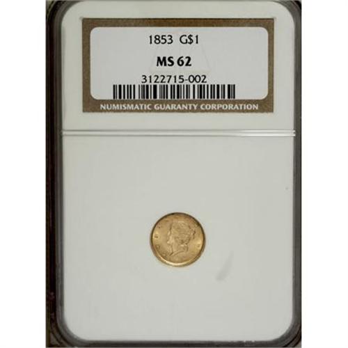 <B>1853 G$1 MS62 NGC.</B></I> NGC Census: (2562/2054). PCGS Population (1070/1458). Mintage: 4,076,051. Numismedia Wsl. Price for NGC/PCGS coin in MS62: $335. (#7521)<BR><BR><B>Coin Engraver:</B> James B. Longacre<BR><BR><b>Shipping:</b> Coins & Currency (<a target="_blank" href="http://www.heritageauctions.com/common/shipping.php">view shipping information</a>)