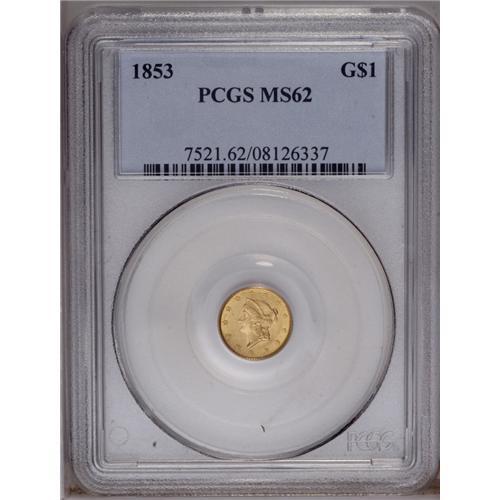 1853 G$1 MS62 PCGS. A splendid specimen with sharp des 1853[G$1] MS62 PCGS.