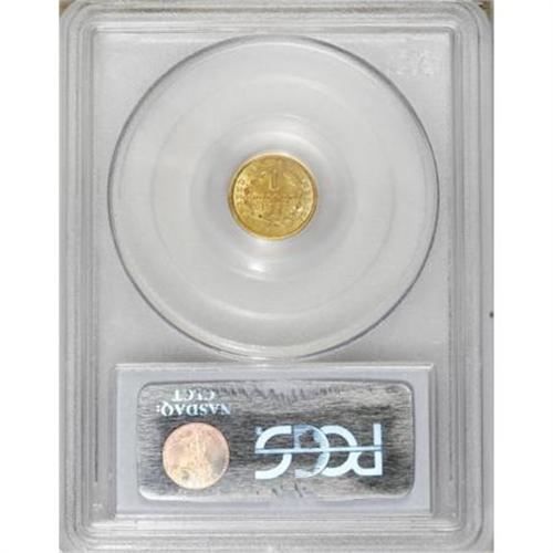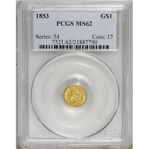 <B>1853 G$1 MS62 PCGS.</B></I> PCGS Population (1033/1408). NGC Census: (2488/2033). Mintage: 4,076,051. Numismedia Wsl. Price for NGC/PCGS coin in MS62: $340. (#7521)<BR><BR><B>Coin Engraver:</B> James B. Longacre<BR><BR><b>Shipping:</b> Coins & Currency (<a target="_blank" href="http://www.heritageauctions.com/common/shipping.php">view shipping information</a>)