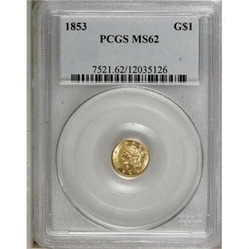 <B>1853 G$1 MS62 PCGS.</B></I> PCGS Population (1038/1421). NGC Census: (2492/2036). Mintage: 4,076,051. Numismedia Wsl. Price for NGC/PCGS coin in MS62: $340. (#7521)<BR><BR><B>Coin Engraver:</B> James B. Longacre<BR><BR><b>Shipping:</b> Coins & Currency (<a target="_blank" href="http://www.heritageauctions.com/common/shipping.php">view shipping information</a>)