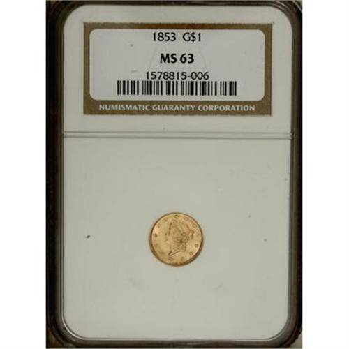 <B>1853 G$1 MS63 NGC.</B></I> NGC Census: (1092/934). PCGS Population (784/623). Mintage: 4,076,051. Numismedia Wsl. Price for NGC/PCGS coin in MS63: $910. (#7521)<BR><BR><B>Coin Engraver:</B> James B. Longacre<BR><BR><b>Shipping:</b> Coins & Currency (<a target="_blank" href="http://www.heritageauctions.com/common/shipping.php">view shipping information</a>)