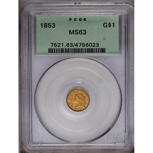 1853 G$1 MS63 PCGS. Boldly struck and lustrous, with a 1853[G$1] MS63 PCGS.