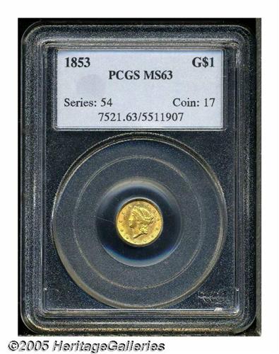 <B>1853<G$1> MS63 PCGS.</B></I> Lustrous surfaces reveal two shades of peach-gold toning. The design elements are well struck, except that some of the star centers are soft. A few grade-defining handling marks are noted over each side.