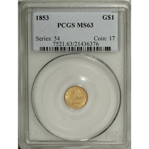 <B>1853 G$1 MS63 PCGS.</B></I> Pearly golden surfaces with good detail and just some minor luster marks in the fields. Great eye appeal, especially for the grade.<BR><BR><b>Shipping:</b> Coins & Currency (<a target="_blank" href="http://www.heritageauctions.com/common/shipping.php">view shipping information</a>)