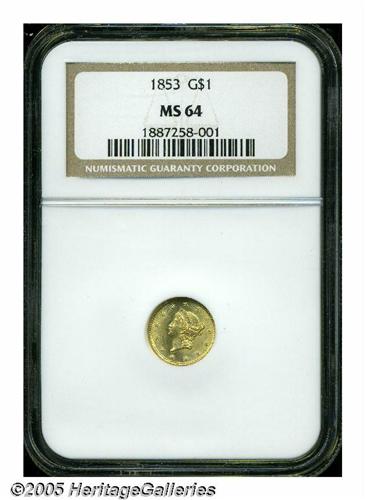 <B>1853<G$1> MS64 NGC.</B></I> An intricately struck and fully lustrous, brassy-gold Gold Dollar, well preserved and with formidable eye appeal. A couple of minute marks on Liberty's cheek are mentioned for accuracy. An excellent choice for a quality gold type set.