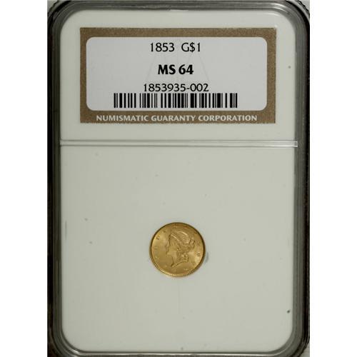 <B>1853 G$1 MS64 NGC.</B></I> Choice and satiny, this butter-yellow near-Gem has distinct orange and rose accents. Solidly struck and appealing with few marks for the grade.<BR><BR><b>Shipping:</b> Coins & Currency (<a target="_blank" href="http://www.heritageauctions.com/common/shipping.php">view shipping information</a>)