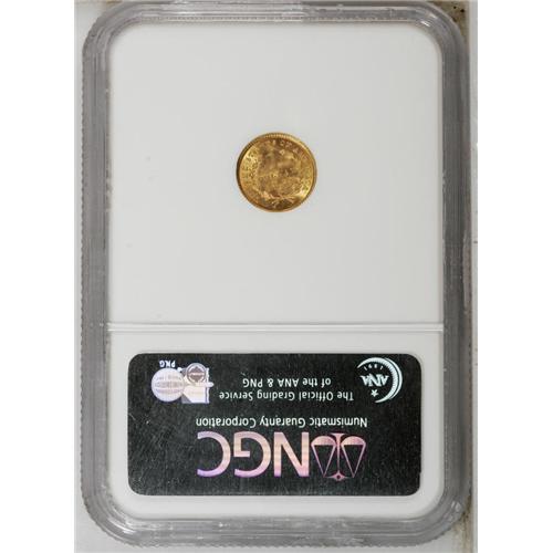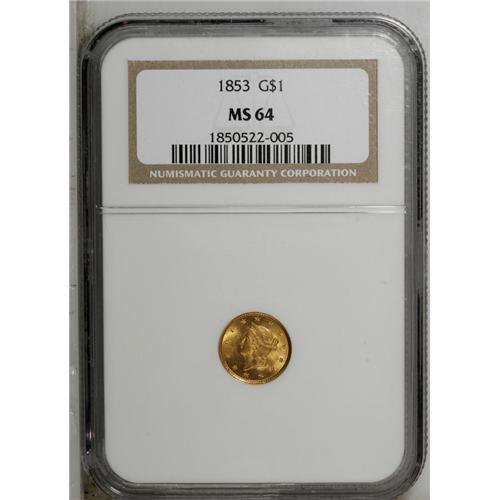 <B>1853<G$1> MS64 NGC.</B></I> Lovely copper-gold and green color is the chief asset of this sharply struck gold dollar. An unusual latticework of raised die lines appears on the portrait, and faint die clash marks are noted on both sides. Lustrous and carefully preserved, with just a few minor marks.
