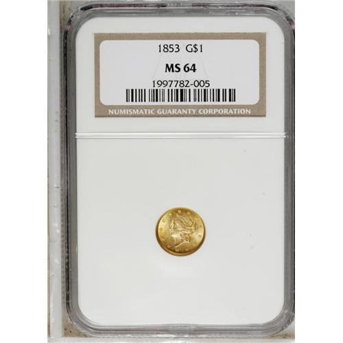 <B>1853 G$1 MS64 NGC.</B></I> The pretty orange-gold surfaces on this available Type One gold dollar are relatively clean, although a few light, grade-consistent and undistracting pinscratches appear under a loupe. A reasonably priced type set selection.<BR><BR><b>Shipping:</b> Coin/Currency (<a target="_blank" href="http://www.heritageauctions.com/common/shipping.php">view shipping information</a>)