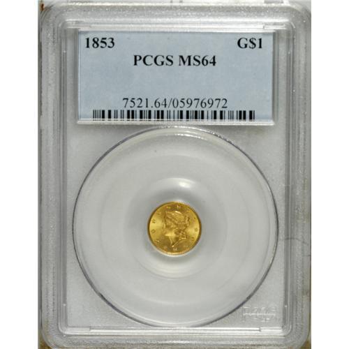 <B>1853 G$1 MS64 PCGS.</B></I> This crisply struck, diminutive dollar is predominantly yellow-gold with occasional apricot accents. Choice and frosty with few marks for the grade.<BR><BR><b>Shipping:</b> Coins & Currency (<a target="_blank" href="http://www.heritageauctions.com/common/shipping.php">view shipping information</a>)