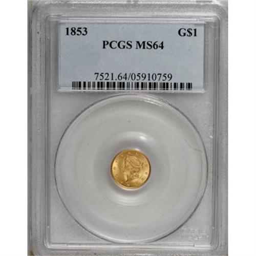 <B>1853 G$1 MS64 PCGS.</B></I> The luminous obverse is wheat-gold, while the yellow-gold reverse shows slightly stronger luster. The pleasingly detailed portrait is carefully preserved, though faint marks are present in the fields. An attractive Type One gold dollar.<BR><BR><B>Coin Engraver:</B> James B. Longacre<BR><BR><b>Shipping:</b> Coins & Currency (<a target="_blank" href="http://www.heritageauctions.com/common/shipping.php">view shipping information</a>)