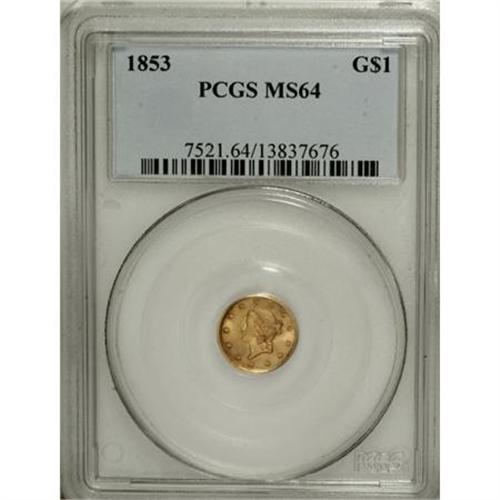 <B>1853 G$1 MS64 PCGS.</B></I> Orange-gold toning and vibrant luster combine with a precise strike and clean surfaces. The portrait of Liberty exhibits numerous raised die lines, as made and perhaps of interest to the specialist.<BR><I>From The Pearl E. Pemberton Collection.</B></I><BR><BR><B>Coin Engraver:</B> James B. Longacre<BR><BR><b>Shipping:</b> Coins & Currency (<a target="_blank" href="http://www.heritageauctions.com/common/shipping.php">view shipping information</a>)