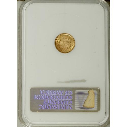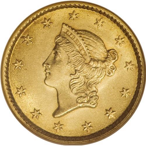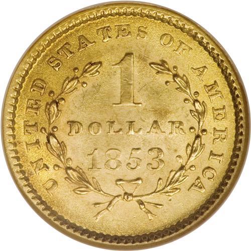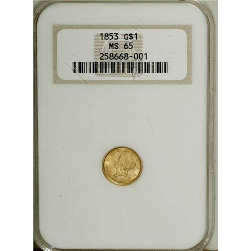 <B>1853 G$1 MS65 NGC.</B></I> By 1851, with the burgeoning supplies of gold caused by the California Gold Rush, the price of silver, reckoned in terms of gold or other measures, skyrocketed past the melt value of silver dollars, which promptly disappeared from circulation. The Philadelphia Mint made enormous numbers of gold dollars in 1851-53 to attempt to compensate for the disappearing silver dollars, and accordingly beautiful Gem coins such as the present example are encountered. The yellow-gold obverse deepens to orange-gold on the reverse, and both sides show intense luster. The strike is bold, and the cumulative effect is impressive.<BR><BR><b>Shipping:</b> Coins & Currency (<a target="_blank" href="http://www.heritageauctions.com/common/shipping.php">view shipping information</a>)