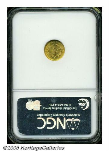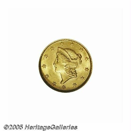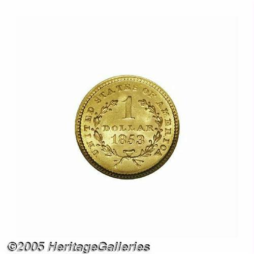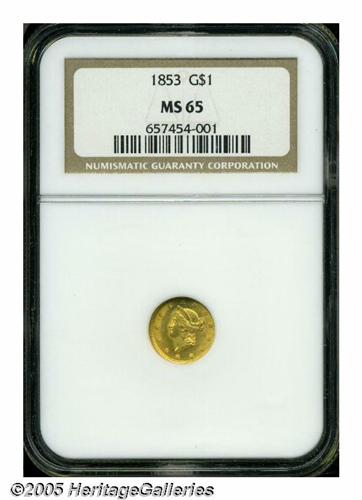 <B>1853<G$1> MS65 NGC.</B></I> The 1853 is one of the most common Type One Gold Dollars in grades short of MS65. At the present level of preservation, this issue is scarce, particularly when compared to the number of Gem quality type collectors in today's hobby. Both sides of this coin present a smooth, satiny, yellow-gold sheen. The strike is crisp, and the luster is fully frosted. Population: 129 in 65, 66 finer (5/05).