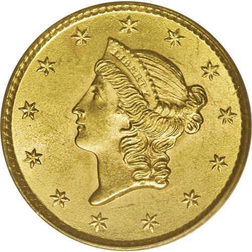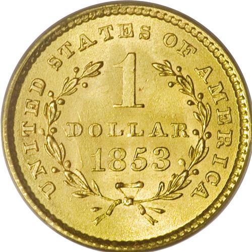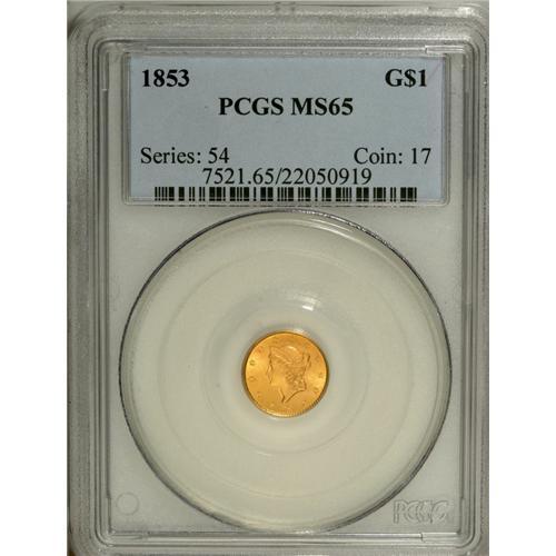 <B>1853 G$1 MS65 PCGS.</B></I> An incredible Type One gold dollar that would be equally at home in a fine date set or a Gem-level type set. The highly lustrous butter-yellow surfaces are frosty with hints of orange on each side. Boldly detailed with only a few insubstantial marks in the fields. Plentiful in grades approaching MS65, but at such a lofty level, even this issue becomes elusive, particularly with the eye appeal of this example.<BR><I>From The Freedom Collection.</B></I><BR><BR><b>Shipping:</b> Coin/Currency (<a target="_blank" href="http://www.heritageauctions.com/common/shipping.php">view shipping information</a>)